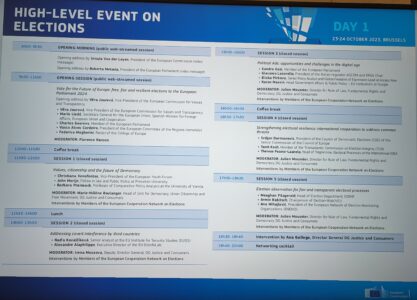 Brussels, 23/24 October 2023: The European Commission (EC) organised the first High-Level Event on Elections for EU Member States’ Election Management Bodies (EMB) ahead of the 6-9 June 2024 European Parliament (EP) elections. The European Commission has been regularly organising meetings of the European Cooperation Network on Elections (ECNE), convening the EU Member States’ Election Management Bodies. For this Conference (agenda) the EC invited various electoral interlocutors including civil society organisations.