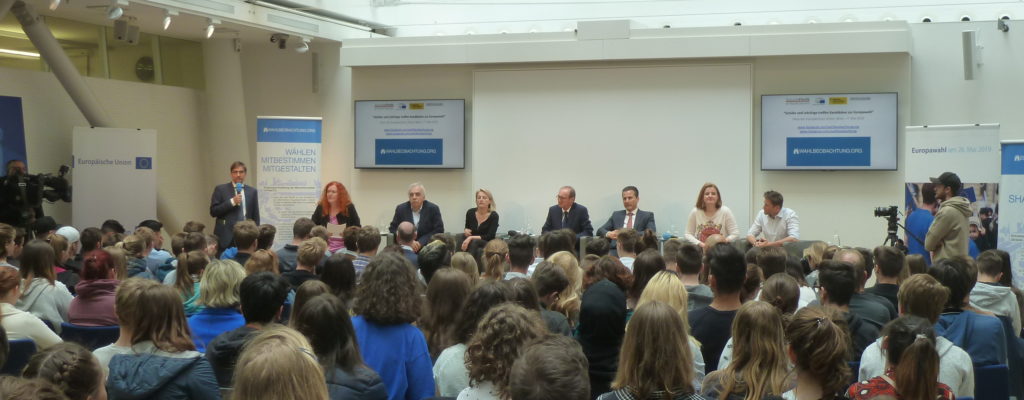 Wien, 7. Mai 2019: Während der Podiumsdiskussion  am 7. Mai im Haus der EU in Wien  kam es zu einem regen Austausch zwischen sechs KandidatInnen zum EU Parlament mit 150 Schülern und Lehrlingen von 5 Schulen aus vier Bundesländern.